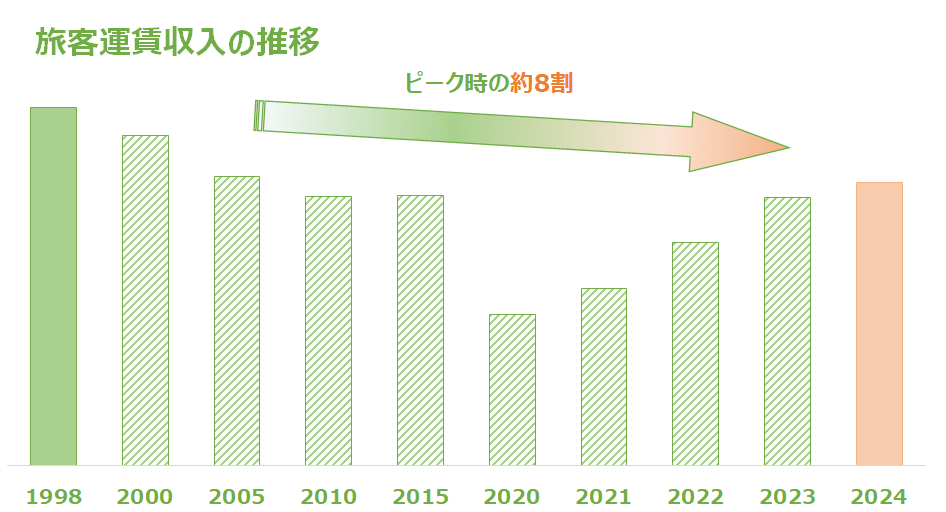 また、旅客運賃収入は、前回の運賃改定の翌年度(1998年度)をピークに減少傾向で、2024年度はピーク時の約8割となっています。