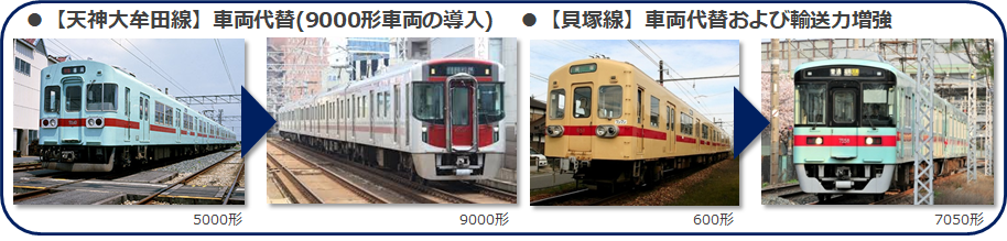 老朽化が進む600形車両(8編成16両)を、現在天神大牟田線で運用している7050形(9編成18両)に順次代替します。在籍車両数を増加させ、朝ラッシュ時の輸送力増強を図ります。