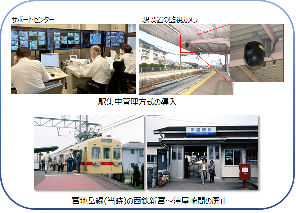 集中管理方式導入による駅運営の効率化のほか、施設・車両・駅務部門における外注化、運転部門におけるワンマン化などを実施し、経営合理化を進めてきました。