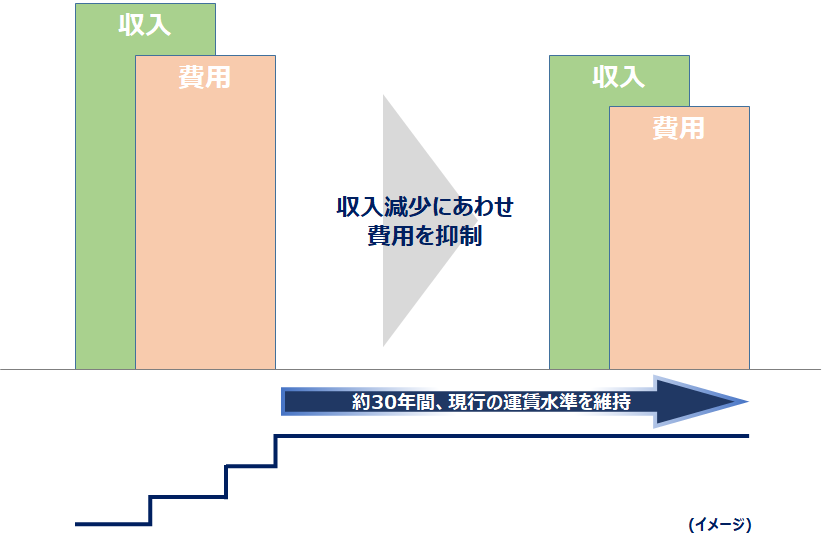 旅客運賃収入の減少に伴い、安全の確保に必要な設備投資を優先に、新造車両への更新やバリアフリー設備の整備など、サービス向上のための設備投資も継続しつつ、積極的にあらゆる経営合理化やコスト削減に取り組んできた結果、消費税率の変更による運賃改定を除き、前回運賃改定を実施した1997年以降、現在に至るまで現行の運賃水準を維持してきました。