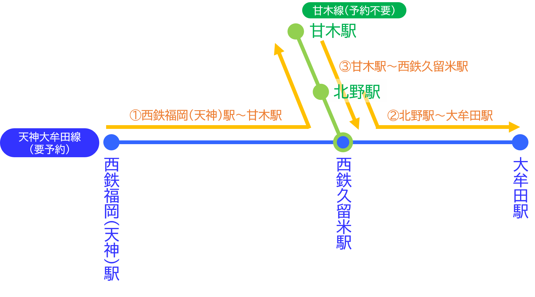 天神大牟田線の特急列車のみ予約が必要です。甘木線は予約不要です。久留米駅から降車する特急停車駅までを予約し、持ち込み料300円のみをお支払いください。